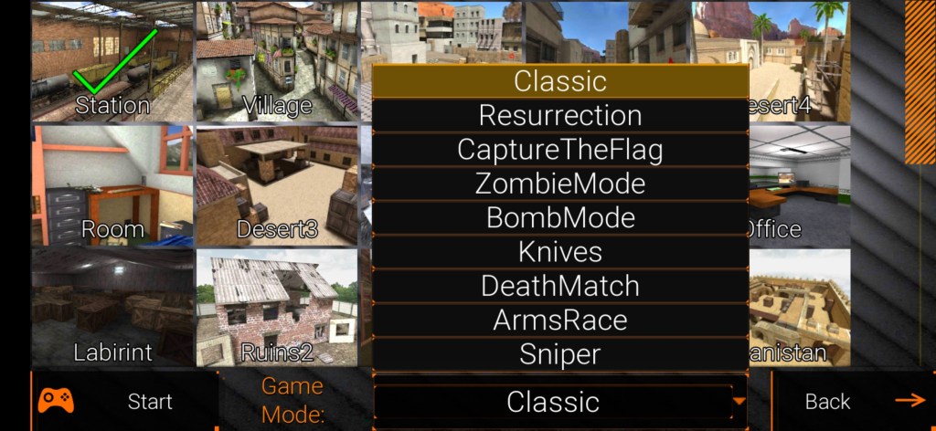 -9 game mode (Classic,Resurrection,Capture the Flag,Zombie Mode,BombMode,Knives,Deathmatch,ArmsRace,Sniper)